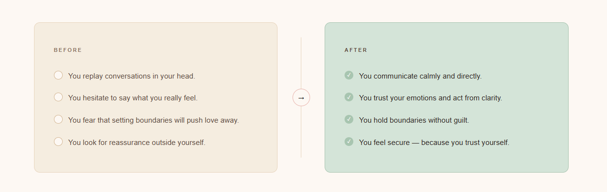 I help women build radical self-trust so they can communicate clearly, set boundaries confidently, and create secure, deeply fulfilling relationships.